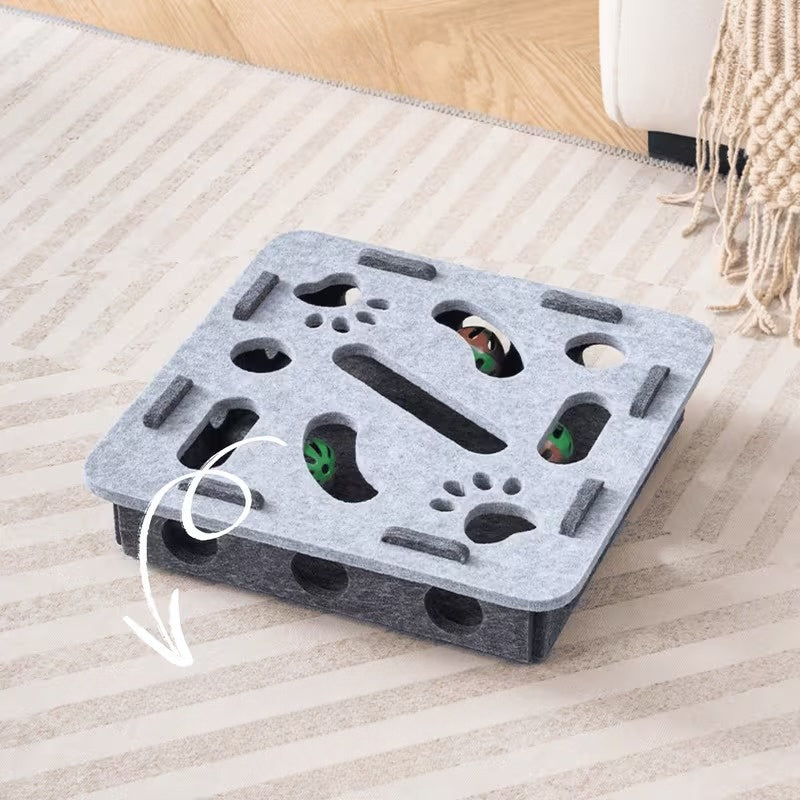 Tā nav parasta rotaļlieta — tā ir pilnvērtīga aktivitāšu stacija ar trim dažādiem elementiem: paslēptiem tuneļiem, bumbiņām un skrāpēšanas virsmām. Kaķe ne tikai ķer bumbiņas, bet arī domā, kā tās izdabūt ārā, bīdot, bakstot ar ķepām un sekojot skaņām. 💥