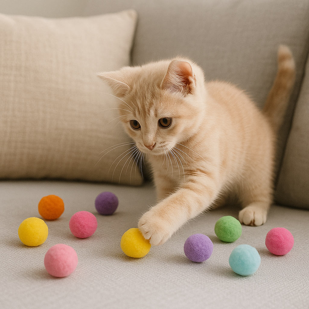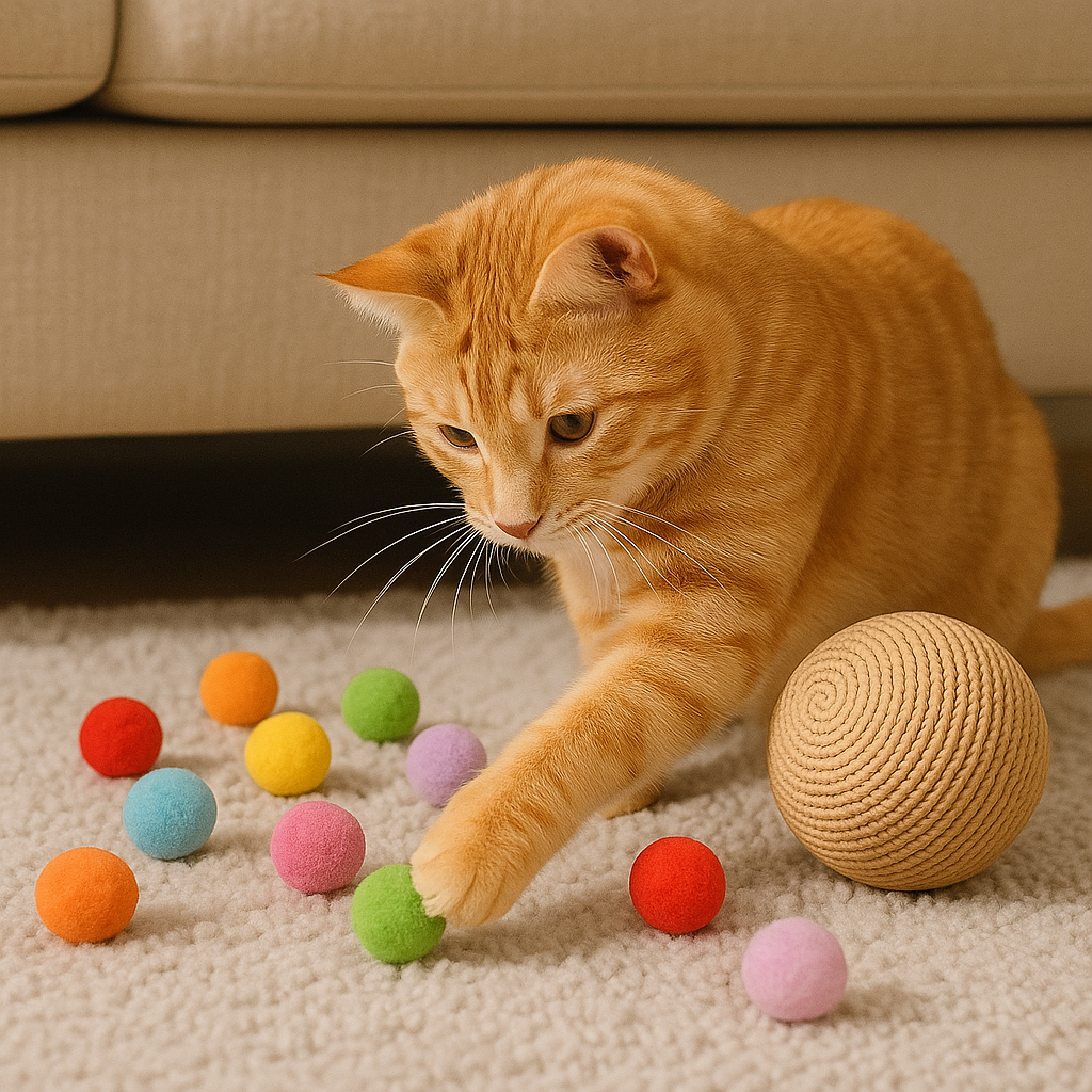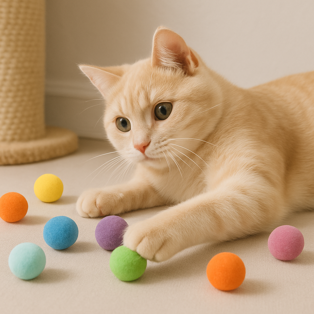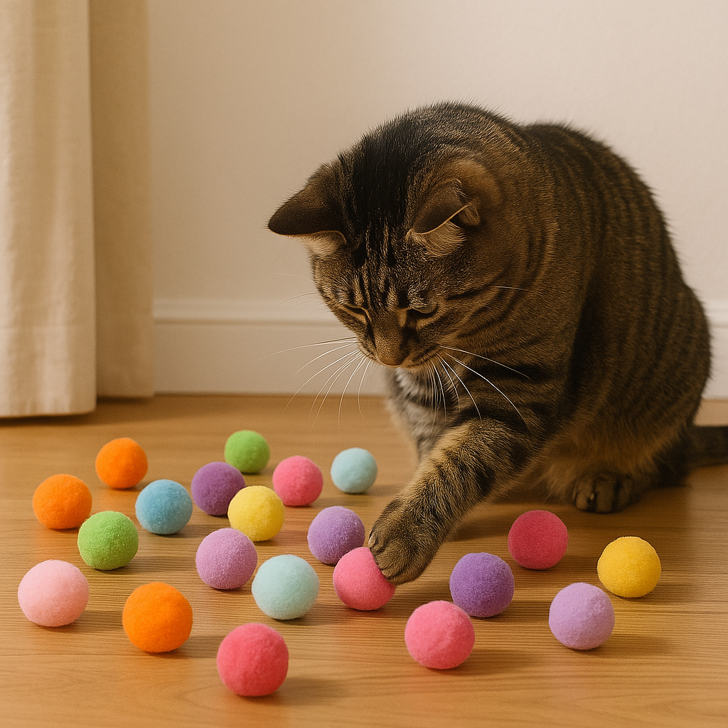 🔄 Pastāvīga kustība. Katra bumbiņa lēkā citādi — kaķe nekad nezina, kas sekos tālāk.
