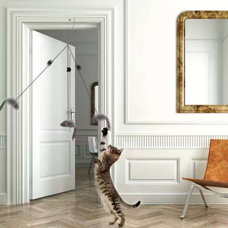 Šajā komplektā ir 2 rotaļlietas, kuras vari viegli piekārt pie durvju stenderes, plaukta malas, voljera vai jebkuras citas vietas mājās. Elastīgā aukla un vieglā rotaļlieta apakšā šūpojas un kustas pat no maiga pieskāriena – kaķim tas izskatās kā dzīvs medījums, kam noteikti jādzenas pakaļ. 💥