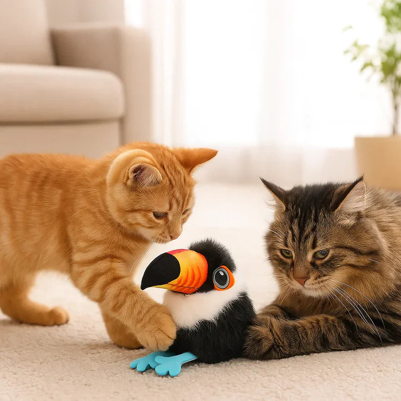Plivinājošā un čivinošā putniņa rotaļlieta kaķiem atgriež dabisku kustīgumu un aizraujošu rotaļu jūsu mājās. Reālistiski spārnu vēzieni un īsti čivināšanas skaņu efekti aktivizē kaķa medību instinktu, rosina kustību, zinātkāri un rada patiesas rotaļas emocijas. Lieliska izvēle gan mājas, gan enerģiskām kaķēm, kurām nepieciešama jēgpilna nodarbe.